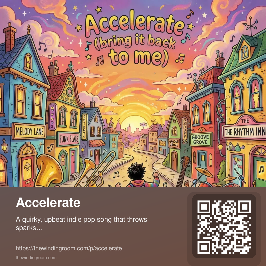 Accelerate started with a simple refrain: “accelerate, speed it up, bring it back to me.” From there it kept slipping sideways in a way I loved. Tuba, music-box, and small brass gestures keep nudging the song off the obvious path, but it never loses its lightness.