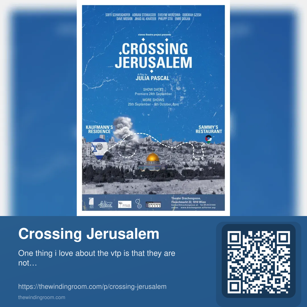 In “Crossing Jerusalem”, emotion, humour and irony abound. Against a backdrop of nationalism and inter-religious dynamics, during a well-intentioned birthday bash, the day-to-day lives of all eight protagonists are deeply impacted. The matriarch Varda (Jewish, a dubious real estate agent), Gideon (her son, a desperate soldier), Sammy (Palestinian Christian, a restaurant owner) Yusuf (Palestinian Muslim and a waiter) and their relatives, mirror the multi-levelled conflict between Israel and the Arab world. The current international, political mood swings beg to keep the discourse about Israel and Palestine alive. In this truly explosive work for the stage, no one is spared.