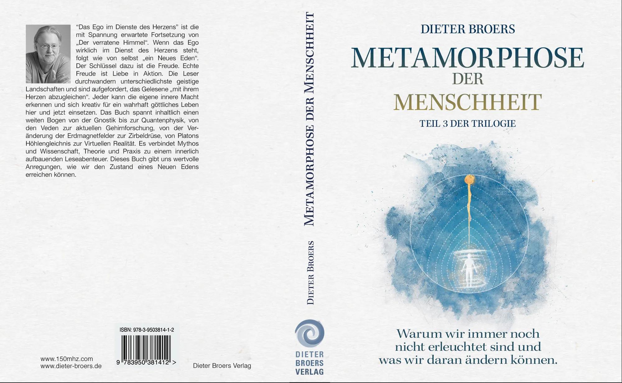 Cover and layout work for Metamorphose der Menschheit (Dieter Broers), designed around a calm, high-contrast system: bright space, crisp typography, and a slightly “cosmic” atmosphere that stays readable from thumbnail to print.