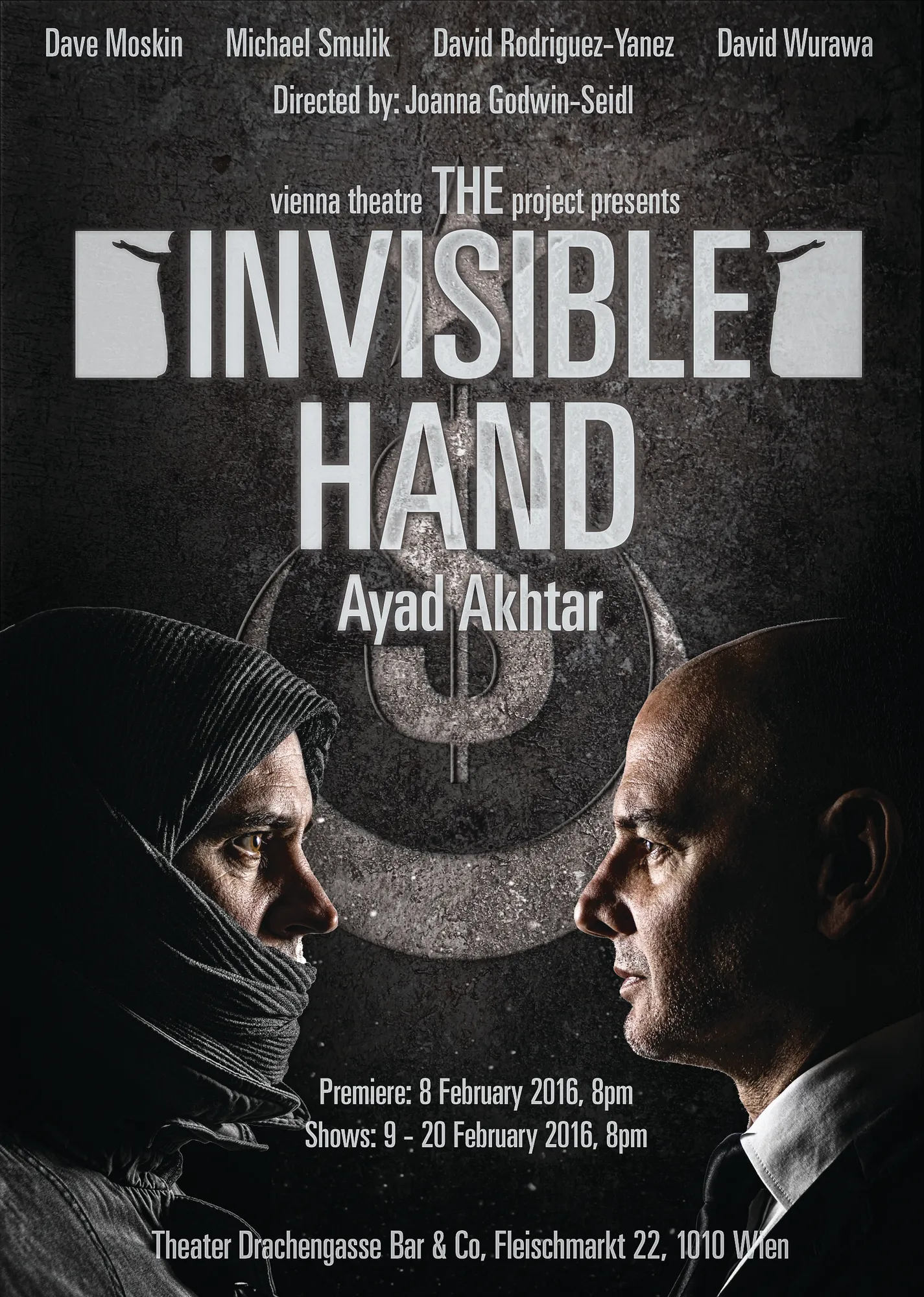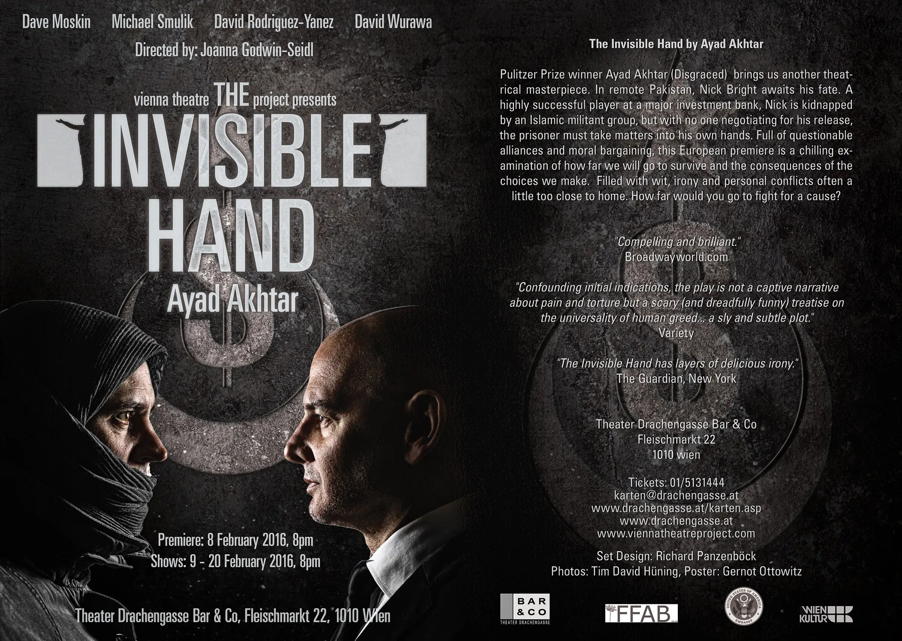 Campaign visuals for a Vienna Theatre Project production: a consistent poster language plus flyer and social assets that keep the same voice across formats.